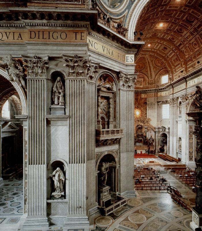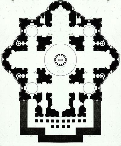 Volvió el artista a la primitiva idea bramantesca del plan central, ahora con una sola entrada principal y no las cuatro abiertas por Bramante a los extremos de la cruz griega, y la dotó de robustos pilares ochavados en el crucero para sostener una más grandiosa cúpula sobre tambor.