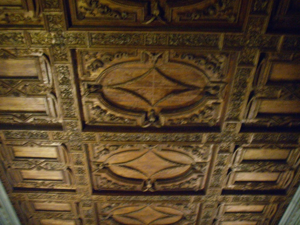 El artesonado de la biblioteca está realizado con motivos elípticos y romboidales