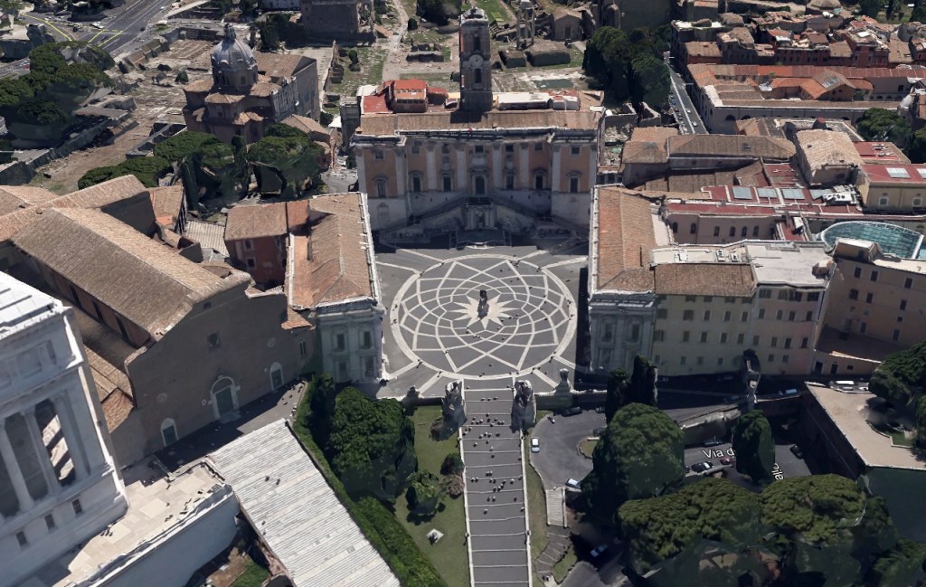 El motivo empleado en el pavimento de la plaza, se diseñó con una retícula curvilínea inscrita en una elipse centrada en el basamento de la estatua de Marco Aurelio, y dividida en doce secciones, que recuerda el símbolo usado en la antigüedad para los doce signos del zodiaco, en alusión a la cúpula celestial. También es una referencia a la arquitectura cristiana, con el símbolo de los doce apóstoles.