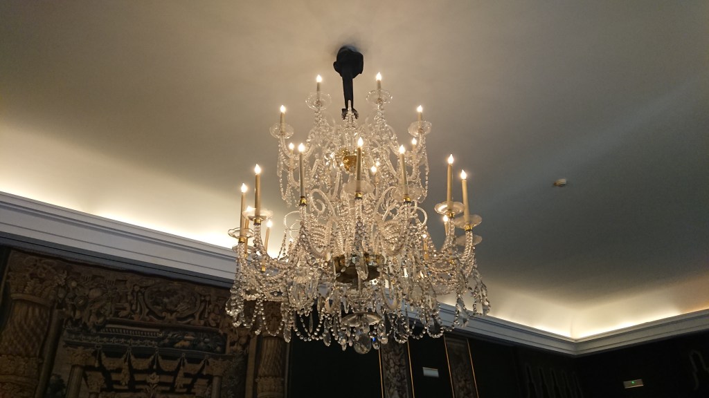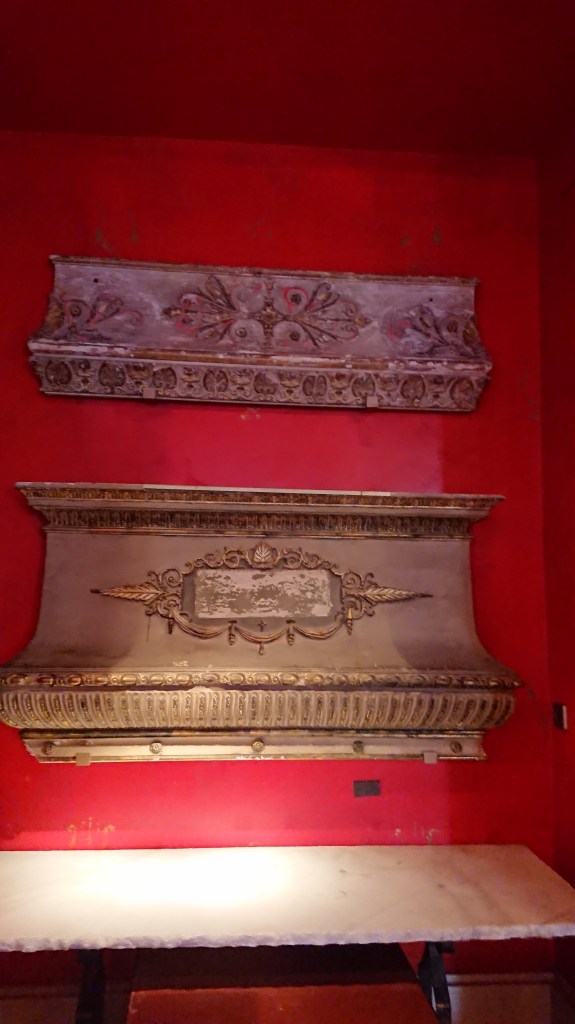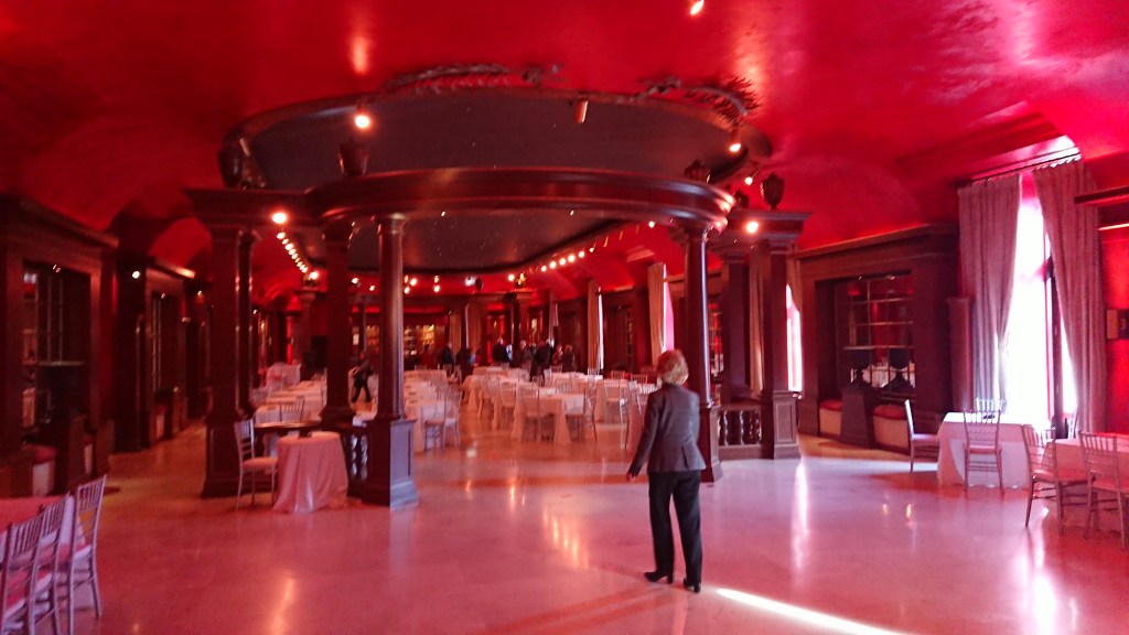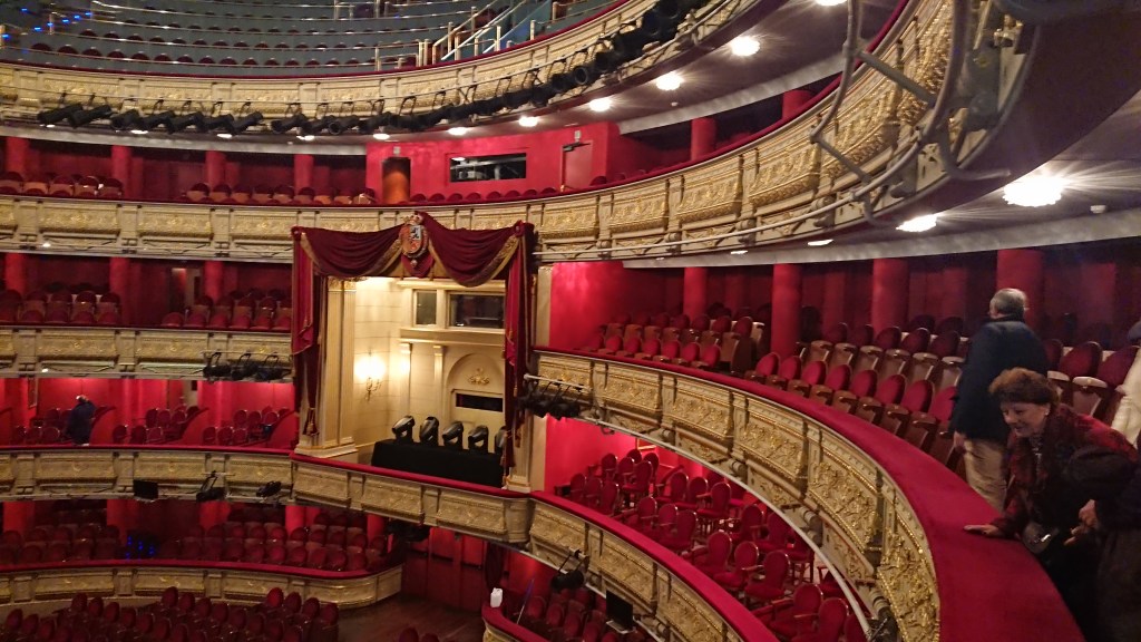 Desde el foyer subimos a la primera planta a un palco lateral desde el cual contemplamos la sala con su maravillosa lámpara, el palco real utilizado como zona de apoyo a la iluminación escénica, y el escenario solo la mitad, cortado con un panorama que no dejaba ver el tamaño real de este escenario.