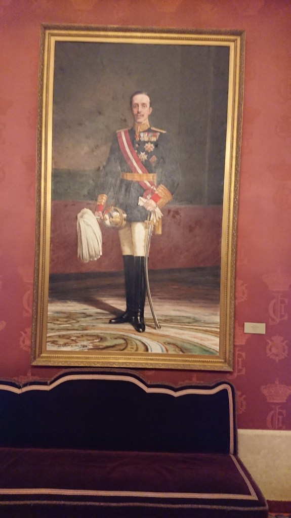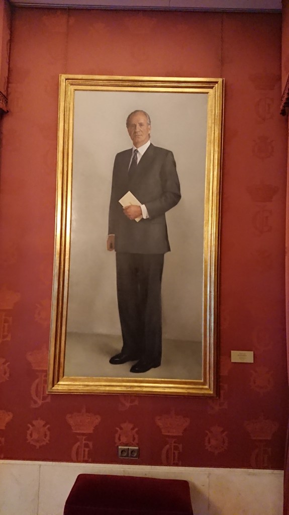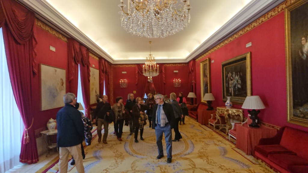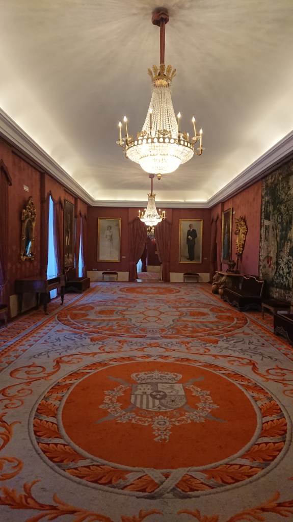 Subimos al segundo piso, accesible para todo el público asistente, permite circular por todo el perímetro del edificio, pasamos por el salón Carlos III donde dominan los tonos azules presidido por una inmensa alfombra, y gracias a la perfecta distribución de sus espejos, le dan mayor amplitud y luminosidad al entorno haciéndolo especialmente agradable.