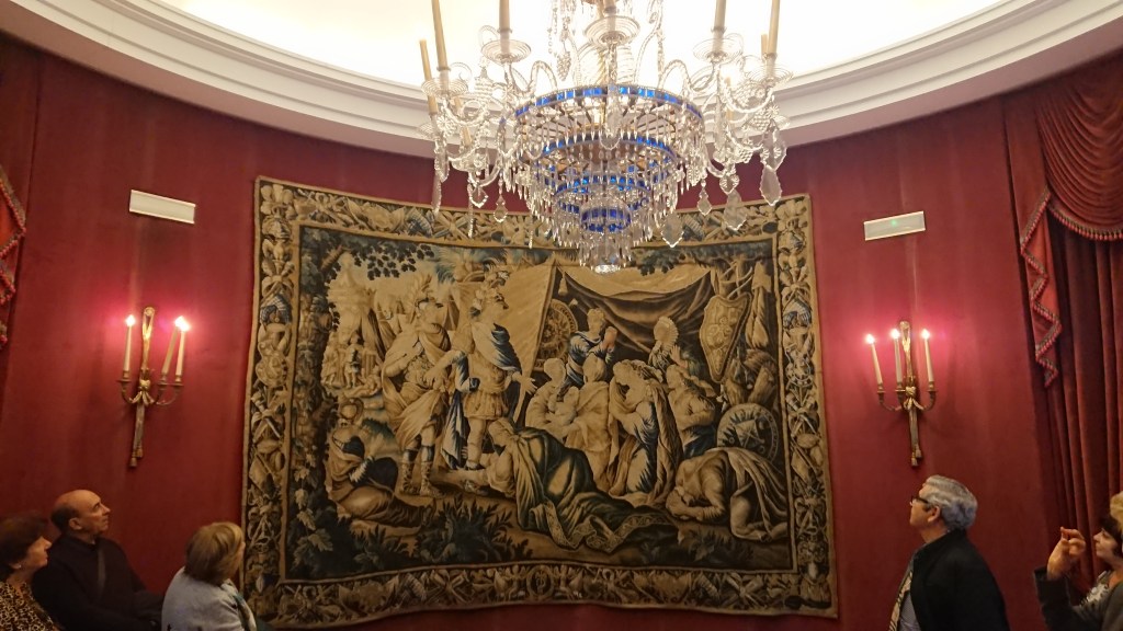 Al salir del salón de baile pasamos por la rotonda donde nos llama la atención la lámpara y el tapiz, para pasar al salón Arrieta en éste destaca también la lámpara que adornaba el antiguo Palco Real del Teatro antes de su reforma, además llaman la atención los elaborados tapices que visten sus paredes, fabricados en Bruselas y en la Real Fábrica de Tapices en los siglos XVII y XVIII.